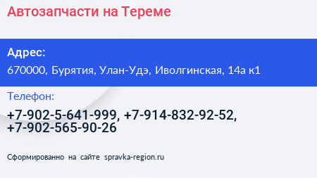 Автозапчасти на Тереме по адресу 670000, Бурятия, Улан-Удэ, Иволгинская, 14а к1 в дальнейшем Организация, размещена в следующих категориях: