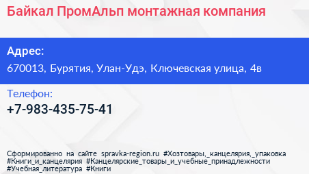 Байкал ПромАльп, монтажная компания по адресу 670013, Бурятия, Улан-Удэ, Ключевская улица, 4в в дальнейшем Организация, размещена в следующих категориях: