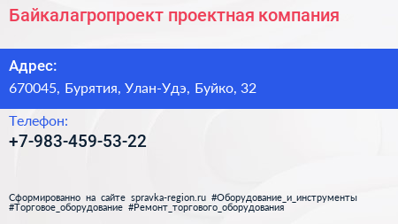 Байкалагропроект, проектная компания по адресу 670045, Бурятия, Улан-Удэ, Буйко, 32 в дальнейшем Организация, размещена в следующих категориях: