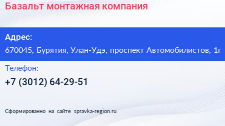 Базальт, монтажная компания по адресу 670045, Бурятия, Улан-Удэ, проспект Автомобилистов, 1г в дальнейшем Организация, размещена в следующих категориях: