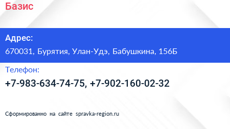 Базис по адресу 670031, Бурятия, Улан-Удэ, Бабушкина, 156Б в дальнейшем Организация, размещена в следующих категориях: