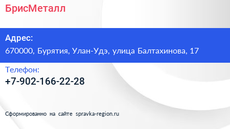 БрисМеталл по адресу 670000, Бурятия, Улан-Удэ, улица Балтахинова, 17 в дальнейшем Организация, размещена в следующих категориях: