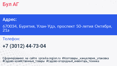 Бул АГ по адресу 670034, Бурятия, Улан-Удэ, проспект 50-летия Октября, 21а в дальнейшем Организация, размещена в следующих категориях: