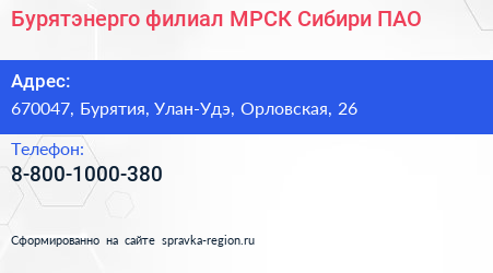 Бурятэнерго, филиал МРСК Сибири, ПАО по адресу 670047, Бурятия, Улан-Удэ, Орловская, 26 в дальнейшем Организация, размещена в следующих категориях: