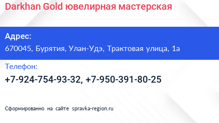 Darkhan Gold, ювелирная мастерская по адресу 670045, Бурятия, Улан-Удэ, Трактовая улица, 1а в дальнейшем Организация, размещена в следующих категориях: