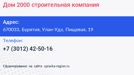 Дом 2000, строительная компания по адресу 670033, Бурятия, Улан-Удэ, Пищевая, 19 в дальнейшем Организация, размещена в следующих категориях: