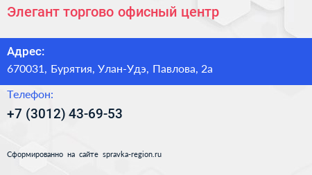 Элегант, торгово-офисный центр по адресу 670031, Бурятия, Улан-Удэ, Павлова, 2а в дальнейшем Организация, размещена в следующих категориях: