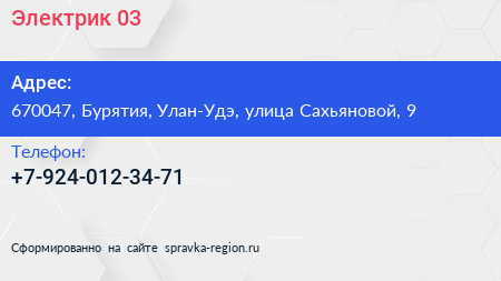 Электрик 03 по адресу 670047, Бурятия, Улан-Удэ, улица Сахьяновой, 9 в дальнейшем Организация, размещена в следующих категориях: