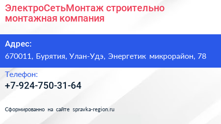 ЭлектроСетьМонтаж, строительно-монтажная компания по адресу 670011, Бурятия, Улан-Удэ, Энергетик микрорайон, 78 в дальнейшем Организация, размещена в следующих категориях: