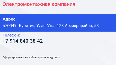 Электромонтажная компания по адресу 670049, Бурятия, Улан-Удэ, 123-й микрорайон, 53 в дальнейшем Организация, размещена в следующих категориях: