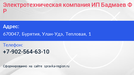 Электротехническая компания, ИП Бадмаев Ф.Р. по адресу 670047, Бурятия, Улан-Удэ, Тепловая, 1 в дальнейшем Организация, размещена в следующих категориях: