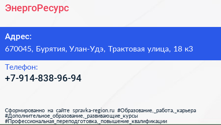 ЭнергоРесурс по адресу 670045, Бурятия, Улан-Удэ, Трактовая улица, 18 к3 в дальнейшем Организация, размещена в следующих категориях: