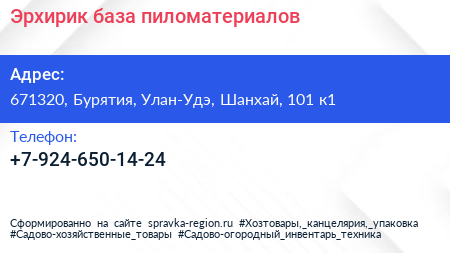 Эрхирик, база пиломатериалов по адресу 671320, Бурятия, Улан-Удэ, Шанхай, 101 к1 в дальнейшем Организация, размещена в следующих категориях:
