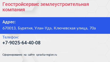 Геостройсервис, землеустроительная компания по адресу 670013, Бурятия, Улан-Удэ, Ключевская улица, 70а в дальнейшем Организация, размещена в следующих категориях: