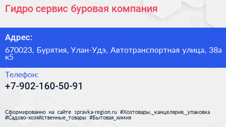 Гидро сервис, буровая компания по адресу 670023, Бурятия, Улан-Удэ, Автотранспортная улица, 38а к5 в дальнейшем Организация, размещена в следующих категориях: