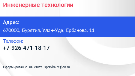 Инженерные технологии по адресу 670000, Бурятия, Улан-Удэ, Ербанова, 11 в дальнейшем Организация, размещена в следующих категориях: