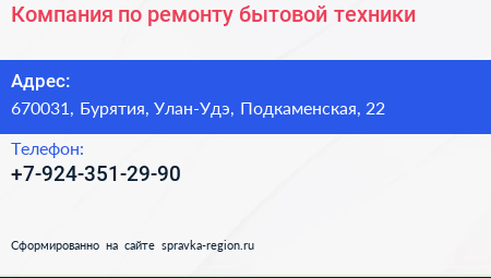 Компания по ремонту бытовой техники по адресу 670031, Бурятия, Улан-Удэ, Подкаменская, 22 в дальнейшем Организация, размещена в следующих категориях:
