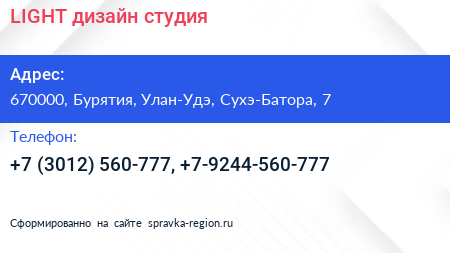LIGHT, дизайн-студия по адресу 670000, Бурятия, Улан-Удэ, Сухэ-Батора, 7 в дальнейшем Организация, размещена в следующих категориях: