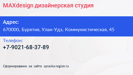 MAXdesign, дизайнерская студия по адресу 670000, Бурятия, Улан-Удэ, Коммунистическая, 45 в дальнейшем Организация, размещена в следующих категориях: