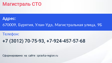 Магистраль, СТО по адресу 670009, Бурятия, Улан-Удэ, Магистральная улица, 9Б в дальнейшем Организация, размещена в следующих категориях: