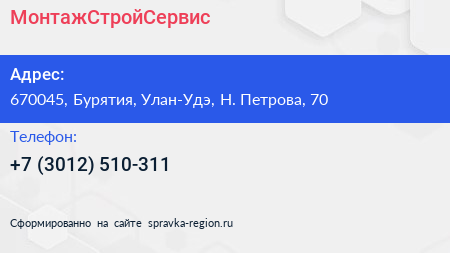 МонтажСтройСервис по адресу 670045, Бурятия, Улан-Удэ, Н. Петрова, 70 в дальнейшем Организация, размещена в следующих категориях:
