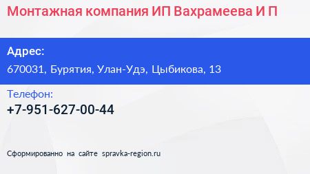 Монтажная компания, ИП Вахрамеева И.П. по адресу 670031, Бурятия, Улан-Удэ, Цыбикова, 13 в дальнейшем Организация, размещена в следующих категориях: