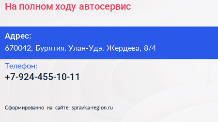 На полном ходу, автосервис по адресу 670042, Бурятия, Улан-Удэ, Жердева, 8/4 в дальнейшем Организация, размещена в следующих категориях: