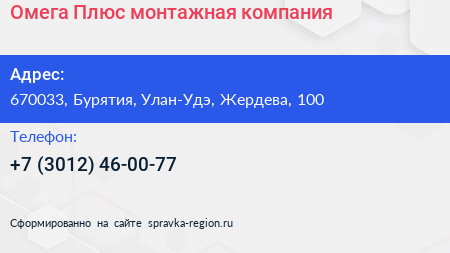 Омега Плюс, монтажная компания по адресу 670033, Бурятия, Улан-Удэ, Жердева, 100 в дальнейшем Организация, размещена в следующих категориях:
