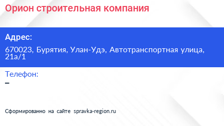 Орион, строительная компания по адресу 670023, Бурятия, Улан-Удэ, Автотранспортная улица, 21а/1 в дальнейшем Организация, размещена в следующих категориях: