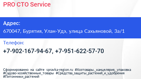 PRO СТО Service по адресу 670047, Бурятия, Улан-Удэ, улица Сахьяновой, 3а/1 в дальнейшем Организация, размещена в следующих категориях: