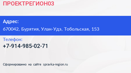 ПРОЕКТРЕГИОН03 по адресу 670042, Бурятия, Улан-Удэ, Тобольская, 153 в дальнейшем Организация, размещена в следующих категориях: