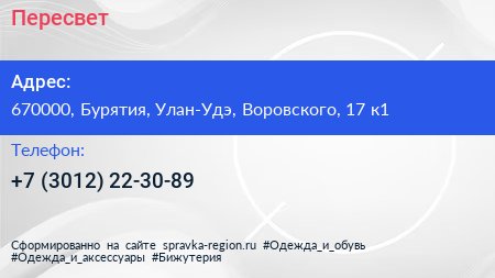 Пересвет по адресу 670000, Бурятия, Улан-Удэ, Воровского, 17 к1 в дальнейшем Организация, размещена в следующих категориях: