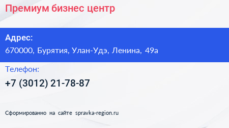 Премиум, бизнес-центр по адресу 670000, Бурятия, Улан-Удэ, Ленина, 49а в дальнейшем Организация, размещена в следующих категориях: