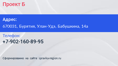 Проект Б по адресу 670031, Бурятия, Улан-Удэ, Бабушкина, 14а в дальнейшем Организация, размещена в следующих категориях: