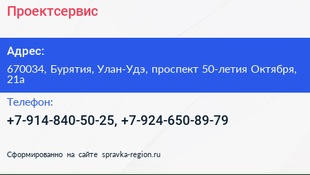Проектсервис по адресу 670034, Бурятия, Улан-Удэ, проспект 50-летия Октября, 21а в дальнейшем Организация, размещена в следующих категориях: