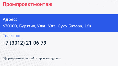 Промпроектмонтаж по адресу 670000, Бурятия, Улан-Удэ, Сухэ-Батора, 16а в дальнейшем Организация, размещена в следующих категориях: