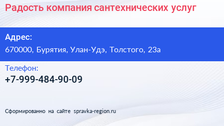 Радость, компания сантехнических услуг по адресу 670000, Бурятия, Улан-Удэ, Толстого, 23а в дальнейшем Организация, размещена в следующих категориях: