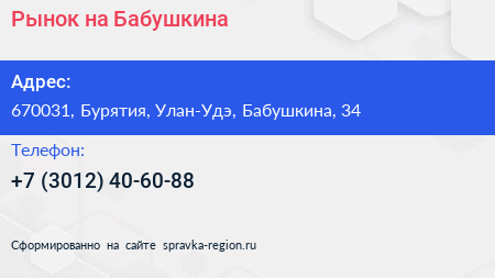 Рынок на Бабушкина по адресу 670031, Бурятия, Улан-Удэ, Бабушкина, 34 в дальнейшем Организация, размещена в следующих категориях: