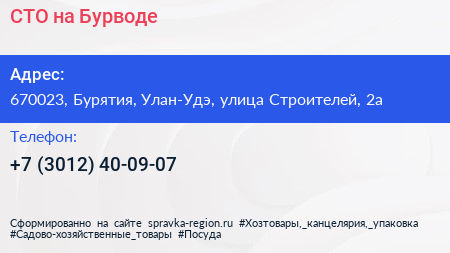 СТО на Бурводе по адресу 670023, Бурятия, Улан-Удэ, улица Строителей, 2а в дальнейшем Организация, размещена в следующих категориях:
