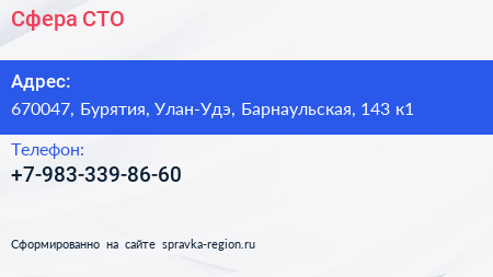 Сфера, СТО по адресу 670047, Бурятия, Улан-Удэ, Барнаульская, 143 к1 в дальнейшем Организация, размещена в следующих категориях: