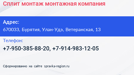 Сплит-монтаж, монтажная компания по адресу 670033, Бурятия, Улан-Удэ, Ветеранская, 13 в дальнейшем Организация, размещена в следующих категориях:
