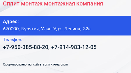 Сплит-монтаж, монтажная компания по адресу 670000, Бурятия, Улан-Удэ, Ленина, 32а в дальнейшем Организация, размещена в следующих категориях: