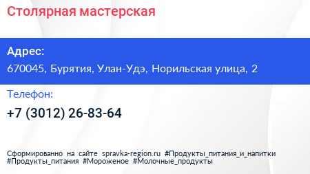 Столярная мастерская по адресу 670045, Бурятия, Улан-Удэ, Норильская улица, 2 в дальнейшем Организация, размещена в следующих категориях: