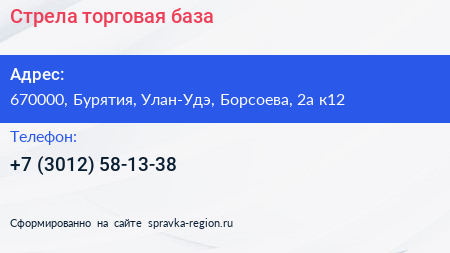 Стрела, торговая база по адресу 670000, Бурятия, Улан-Удэ, Борсоева, 2а к12 в дальнейшем Организация, размещена в следующих категориях: