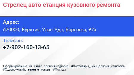 Стрелец-авто, станция кузовного ремонта по адресу 670000, Бурятия, Улан-Удэ, Борсоева, 97а в дальнейшем Организация, размещена в следующих категориях: