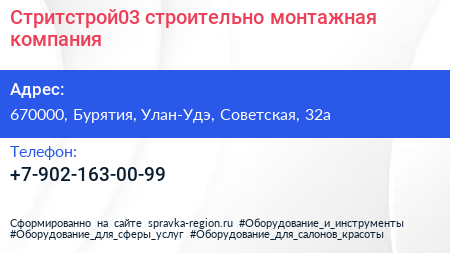 Стритстрой03, строительно-монтажная компания по адресу 670000, Бурятия, Улан-Удэ, Советская, 32а в дальнейшем Организация, размещена в следующих категориях: