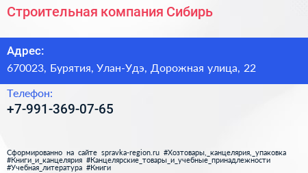 Строительная компания Сибирь по адресу 670023, Бурятия, Улан-Удэ, Дорожная улица, 22 в дальнейшем Организация, размещена в следующих категориях: