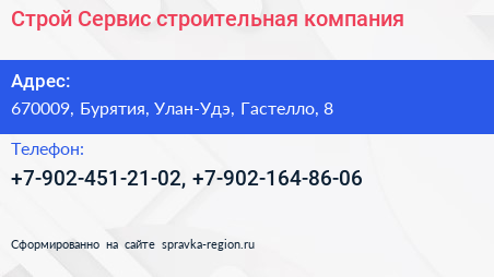 Строй Сервис, строительная компания по адресу 670009, Бурятия, Улан-Удэ, Гастелло, 8 в дальнейшем Организация, размещена в следующих категориях: