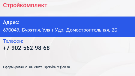 Стройкомплект по адресу 670049, Бурятия, Улан-Удэ, Домостроительная, 2Б в дальнейшем Организация, размещена в следующих категориях: