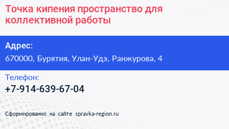 Точка кипения, пространство для коллективной работы по адресу 670000, Бурятия, Улан-Удэ, Ранжурова, 4 в дальнейшем Организация, размещена в следующих категориях: